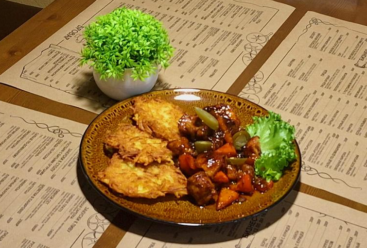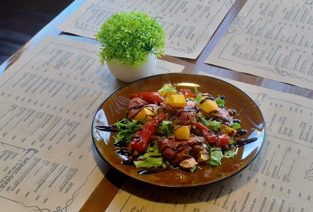 Ростбиф, черри, болгарский маринованный в масле перец, картофель, лук в маринаде из трав , руккола , салат ,заправка, бальзамический соус