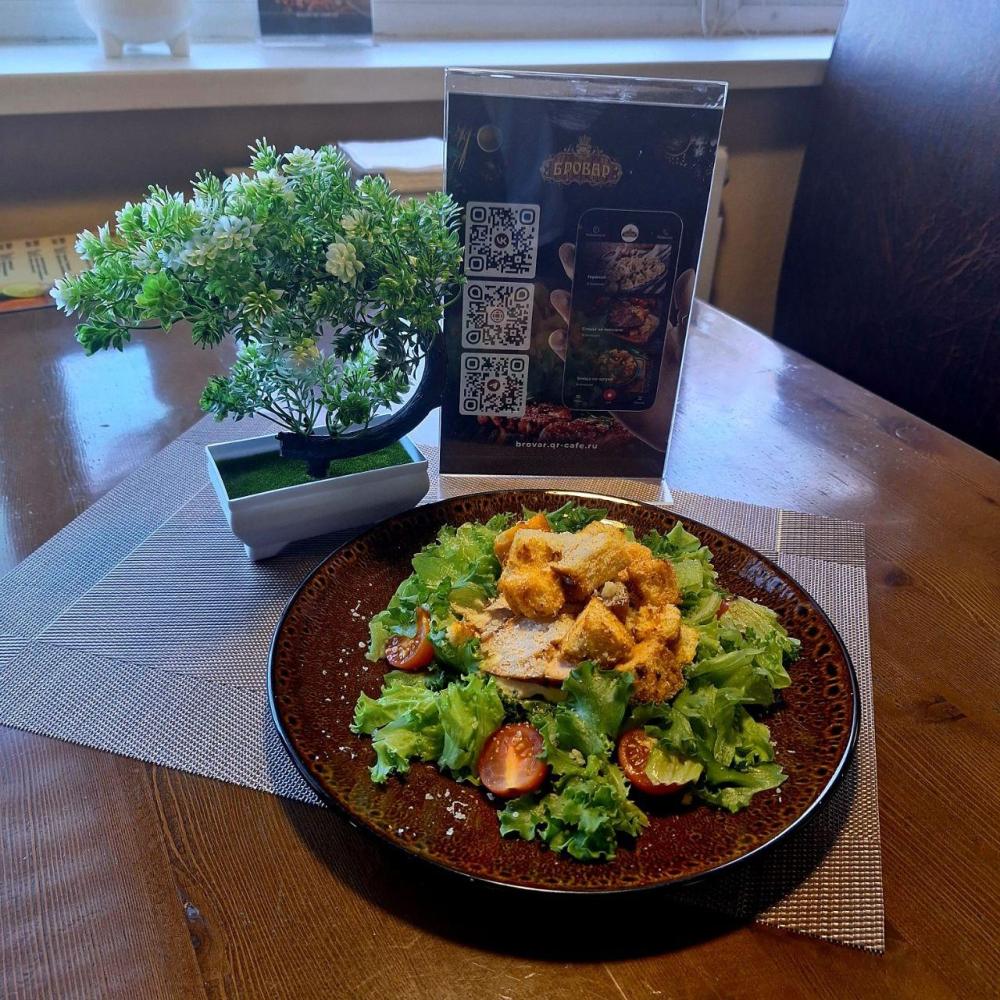 Лист салата, куриная грудка, карбонат, блинчик яичный, перец болгарский, опята, картофель пай, соус цезарь